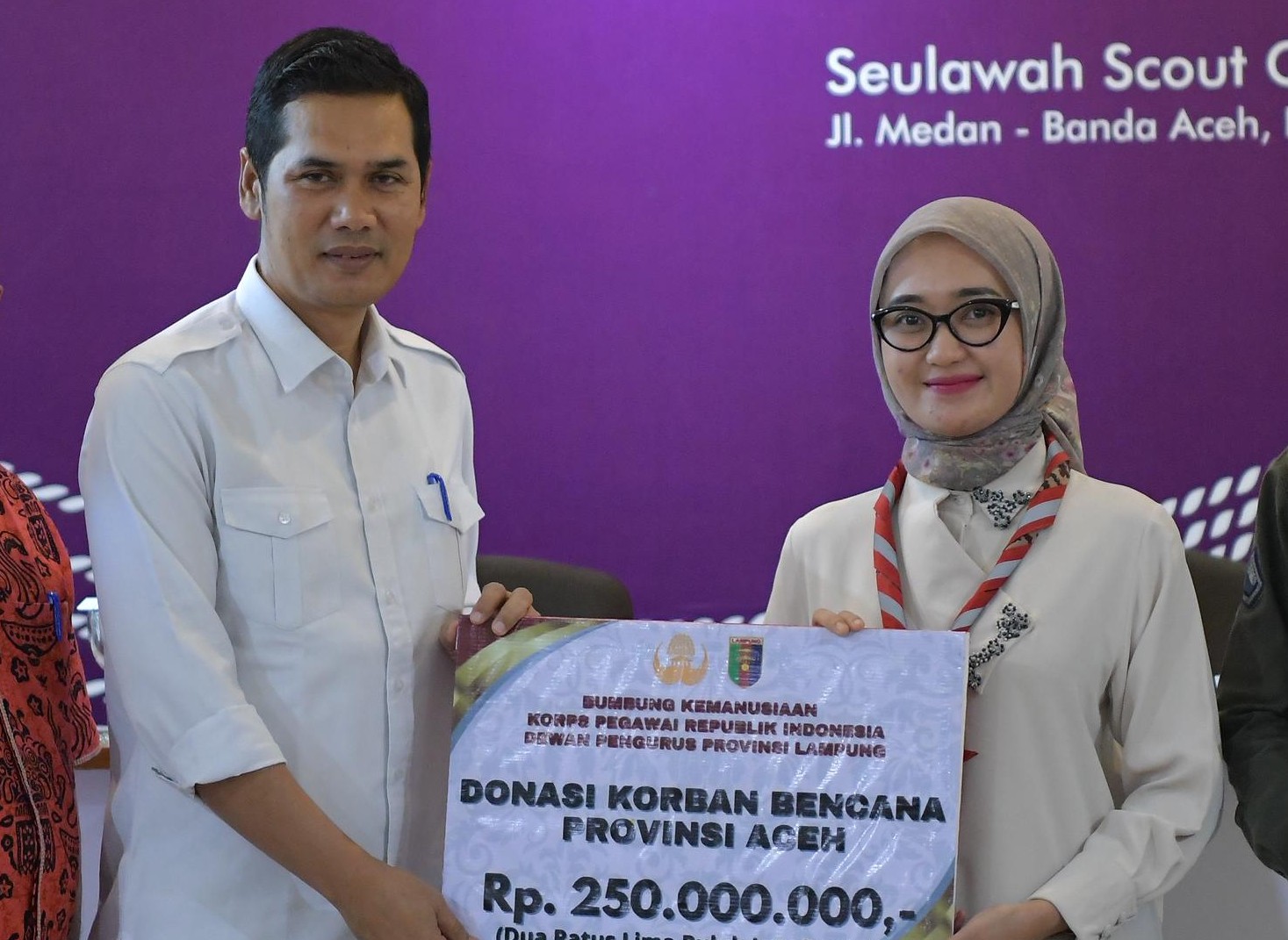 Bantuan diserahkan oleh Wakil Gubernur Lampung dr. Jihan Nurlela yang juga Ketua Kwarda Gerakan Pramuka Lampung, dan diterima oleh Sekretaris Daerah (Sekda) Aceh, M. Nasir, SIP, MPA.