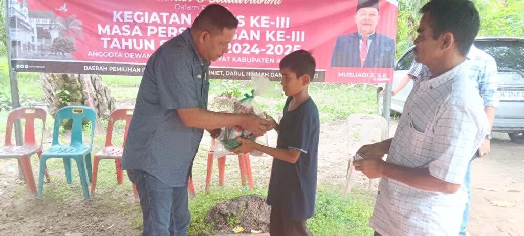 Ketua DPRK Aceh Jaya Musliadi Z, Sedang menyerahkan santunan anak yatim disela-sela reses di Gampong Paya Laot, Kecamatan Setia Bakti, Aceh Jaya, Jumat 24 Oktober 2025. ( Dokumentasi Humas DPRK Aceh Jaya)