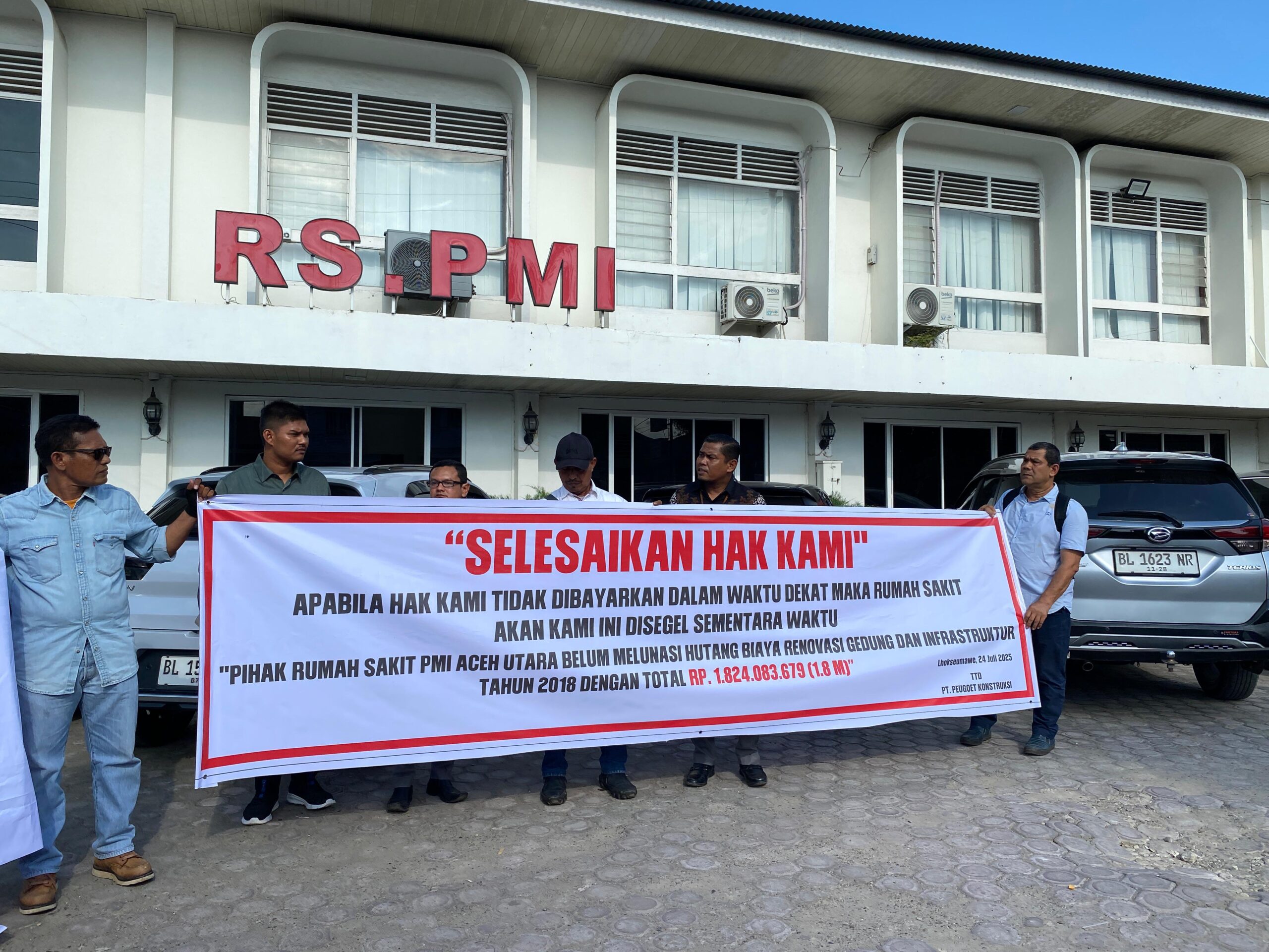 LHOKSEUMAWE – PT Peugot Kontruksi kembali menggelar aksi unjuk rasa di depan Rumah Sakit Palang Merah Indonesia (PMI) Aceh Utara pada Kamis, 24 Juli 2025.