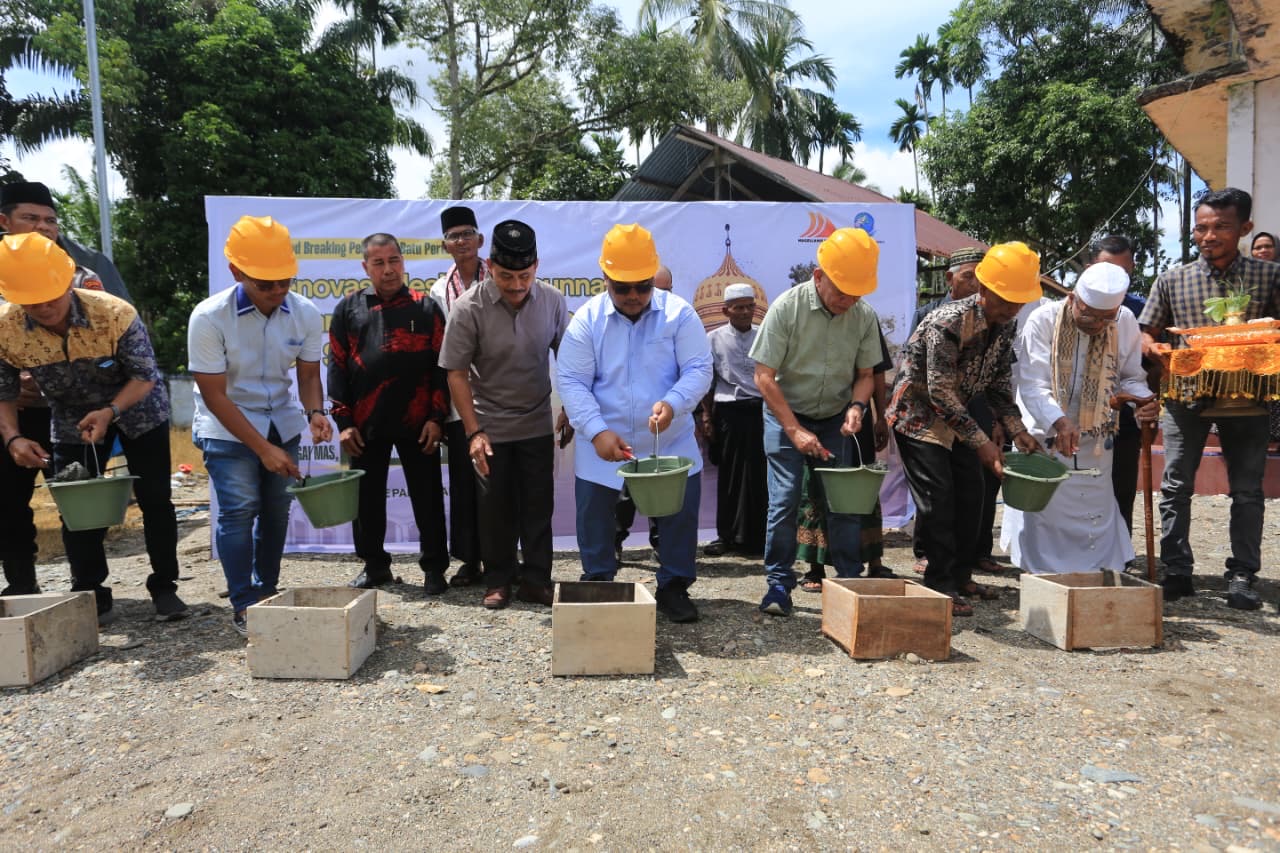 ACEH BARAT – Perusahaan tambang emas PT Magellanic Garuda Kencana (MGK) melakukan peletakan batu pertama rehab pembangunan Masjid Ahlusunnah Wajamaah Gampong, Sipot, Kecamatan Sungai Mas, Aceh Barat, Minggu, 16 November 2025.
